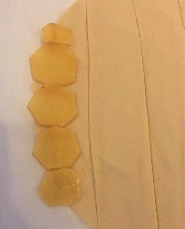 Posiziona le patate su tutta la lunghezza della pasta sfoglia, facendo in modo che per 3/4 siano adagiate sulla pasta sfoglia e il restante quarto esca fuori (sarà il petalo della rosa visibile post cottura). Lascia un pò di spazio alla base, per poter chiudere il fondo della rosa.