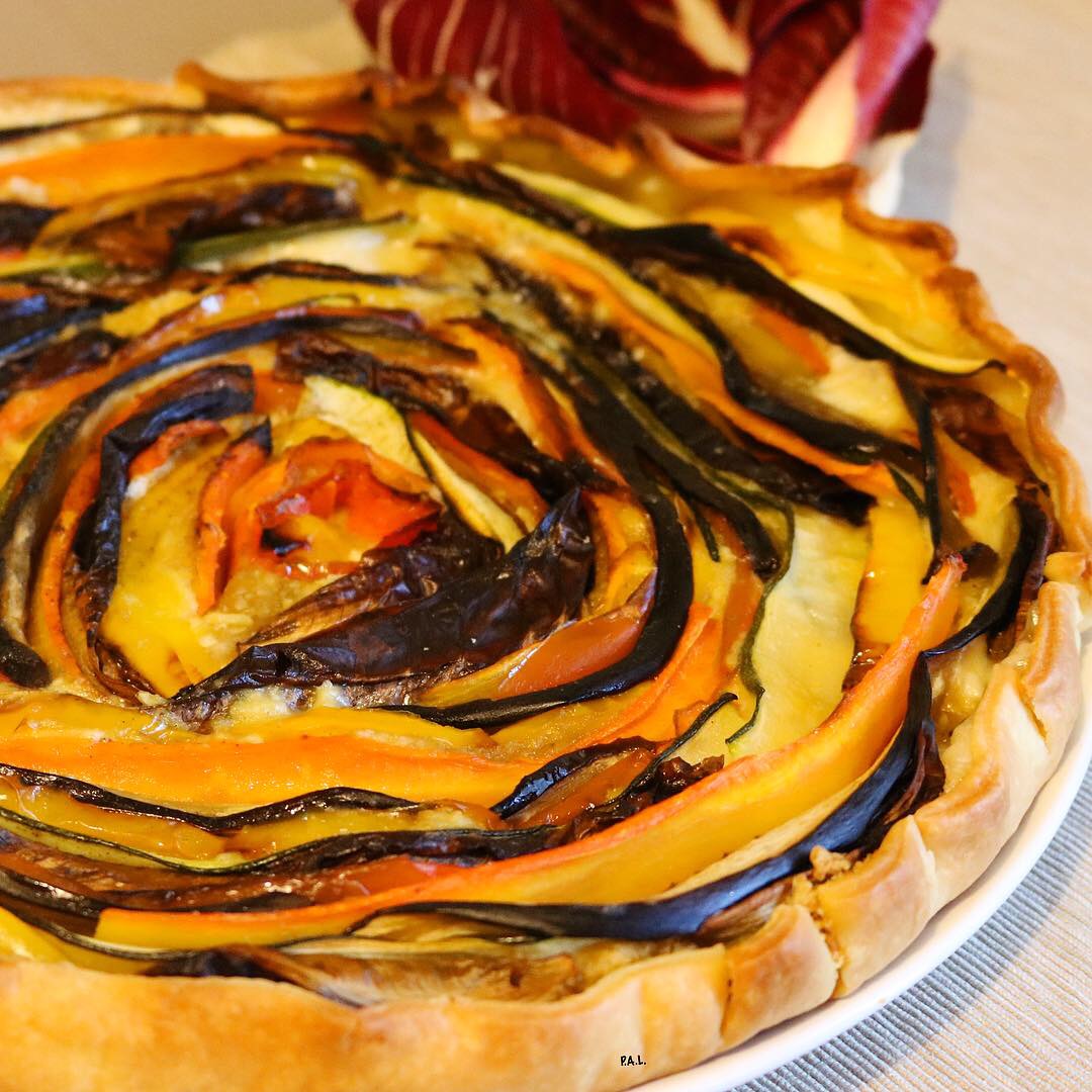 Tagliatele tutte a fettine sottili (cercate di mantenere più o meno lo stesso spessore) e iniziate a disporre le verdure a spirale, partendo dal centro. (Io le melanzane e le zucchine le ho ulteriormente tagliate a metà in senso longitudinale, altrimenti uscivano troppo dal ripieno, mentre il radicchio l’ho piegato su sè stesso.
