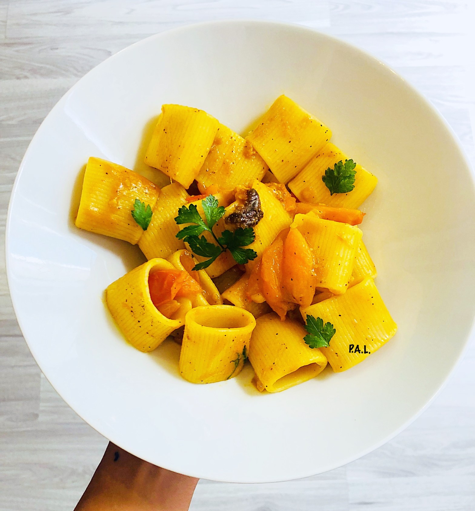 Nonostante a tutti noi venga in mente come primo colore il rosso, il colore originario del pomodoro è il giallo! Ce lo dice il nome stesso: “pomo d’oro”, a richiamo della sua tinta aurea. Io ho iniziato ad utilizzarlo in cucina da quest’anno, perchè grazie alla totale assenza di acidità e al suo sapore dolce, lo trovo ottimo con ricette a base di pesce o comunque accostato a sapori decisi. Qui vi propongo dei mezzi paccheri con datterini gialli e acciughe!