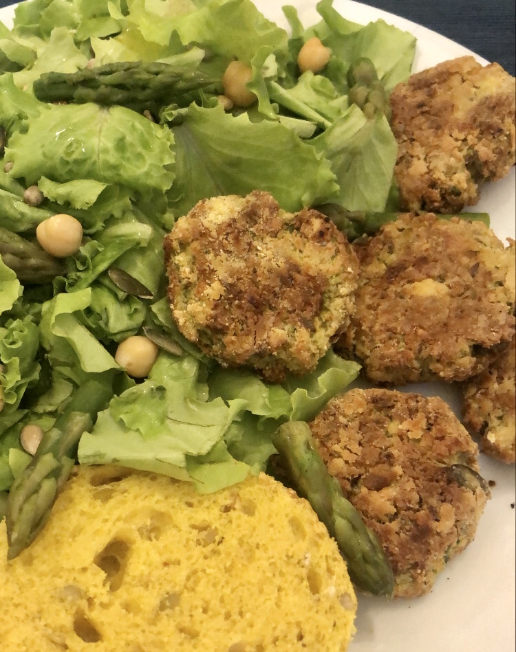 Burger vegani di ceci, asparagi menta e semi oleosi
